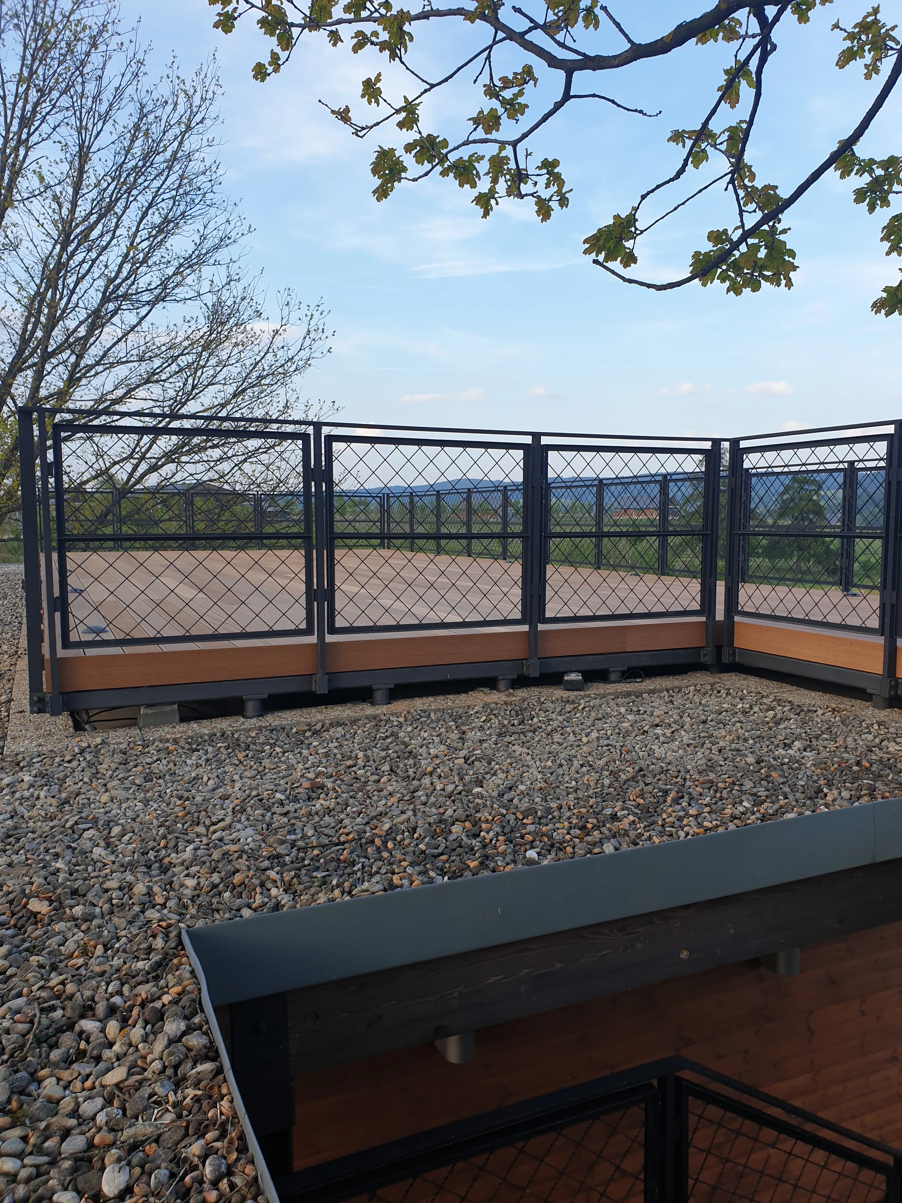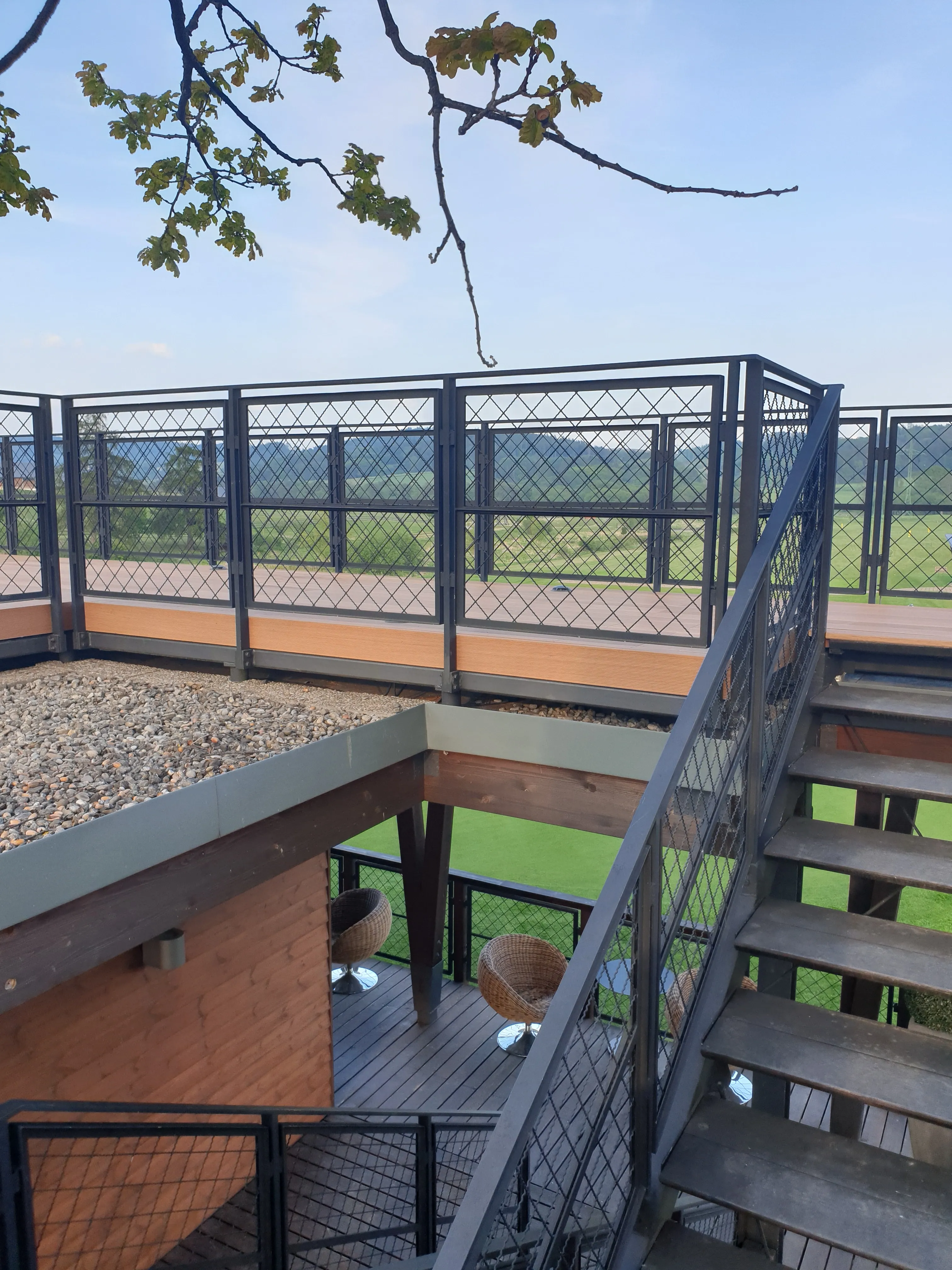 Na prudkém svahu jsme realizovali kompaktní golfový domek tvořený ocelovou konstrukcí usazenou na monolitickém betonovém základu. Toto řešení umožnilo bezpečné založení stavby v náročném terénu a zároveň vytvořilo čistou, moderní architekturu. Součástí objektu je prostorná dřevěná terasa, ze které se otevírá přímý výhled na celé odpalovací místo. Domek tak slouží jako příjemné zázemí pro odpočinek i sledování hry v jedinečném prostředí golfového hřiště.